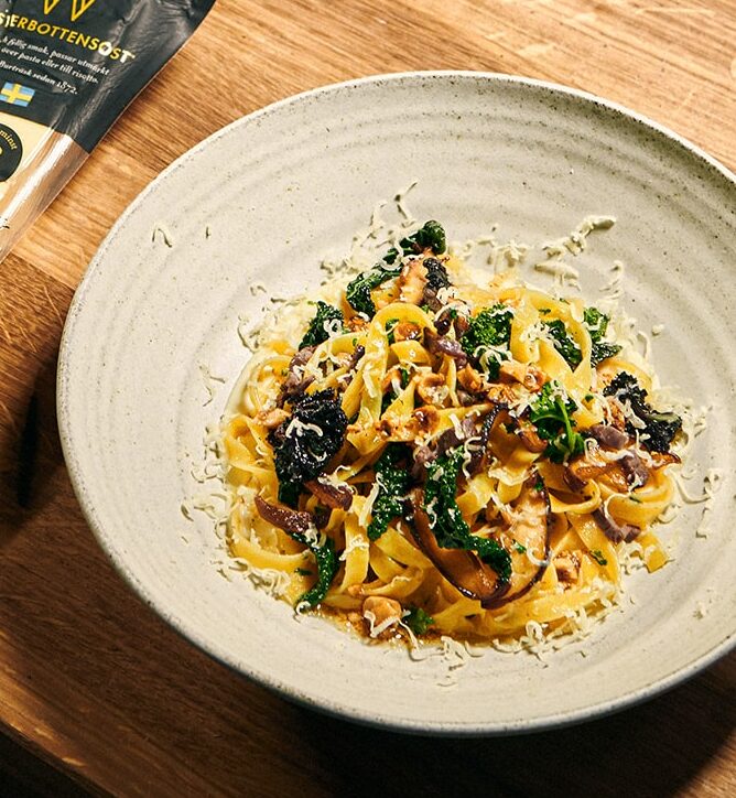 Tämän ruotsalaisen version pasta carbonarasta, jossa on tagliatellea sienillä, suovilla, kaalilla, hasselpähkinöillä, ruskistetulla voilla ja Västerbotten-juustolla®, on kehittänyt Anders Karlsson Ruotsin kulinaarisesta tiimistä.