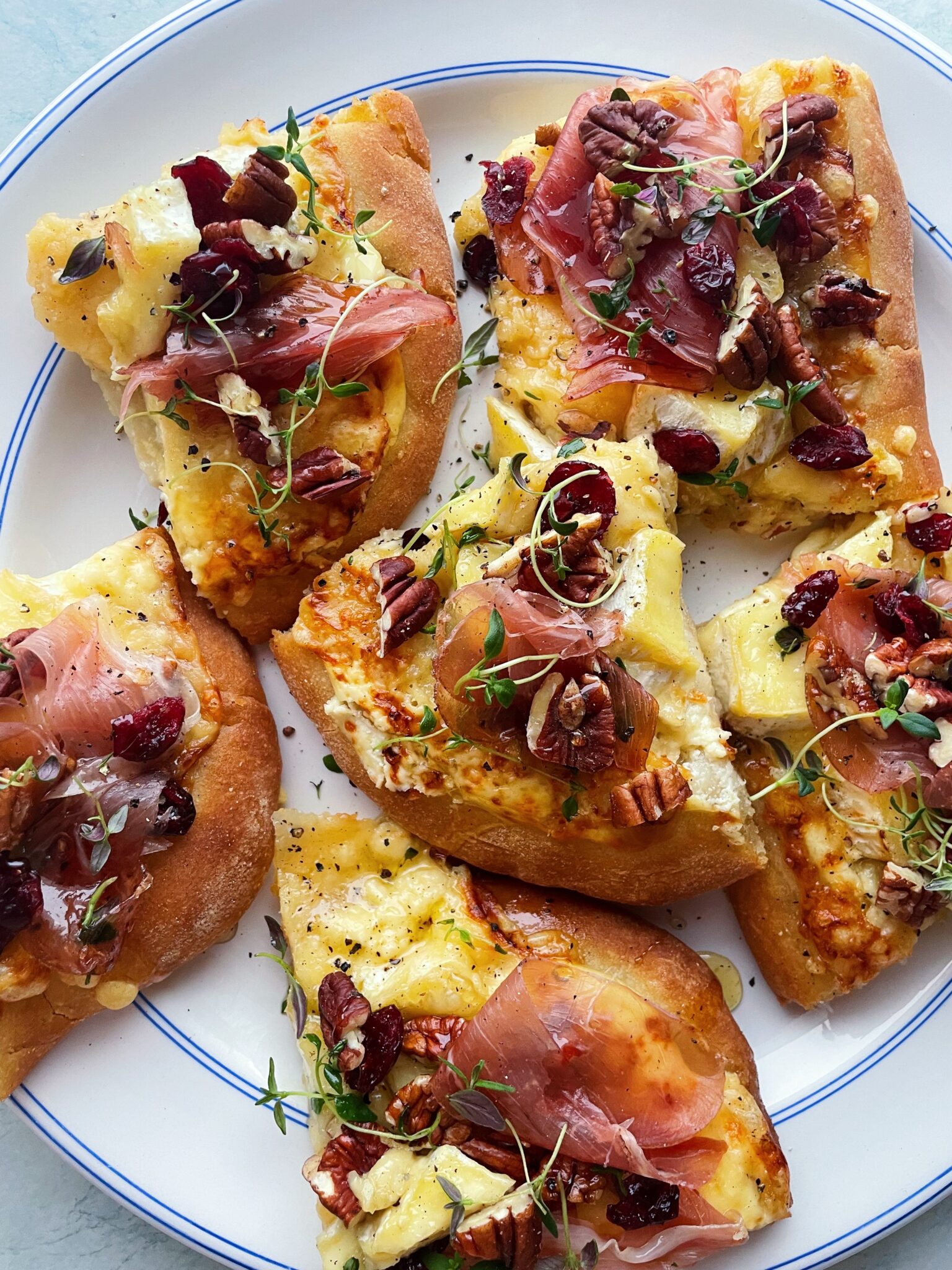 En lättlagad pinsa med juliga smaker! Denna innehåller rikligt med riven Västerbottensost, lufttorkad skinka, torkade tranbär, pecannötter, brie, färsk timjan och honung. Ett tilltugg som passar perfekt till julens alla myskvällar!